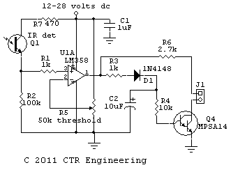 My IR detector. This detector, with the correct IR LED, will detect a train within a 4-foot long block. It has either open collector high current output, or sources enough current to light an external LED.